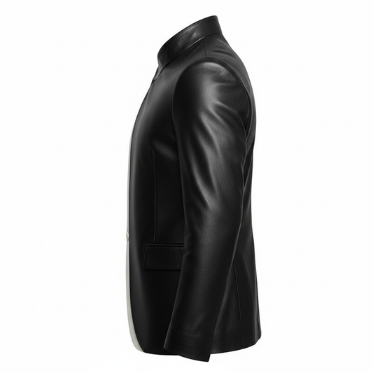 Men's Black Sheep Leather Asymmetrical Neck Long Sleeve Contrast Binding Jacket